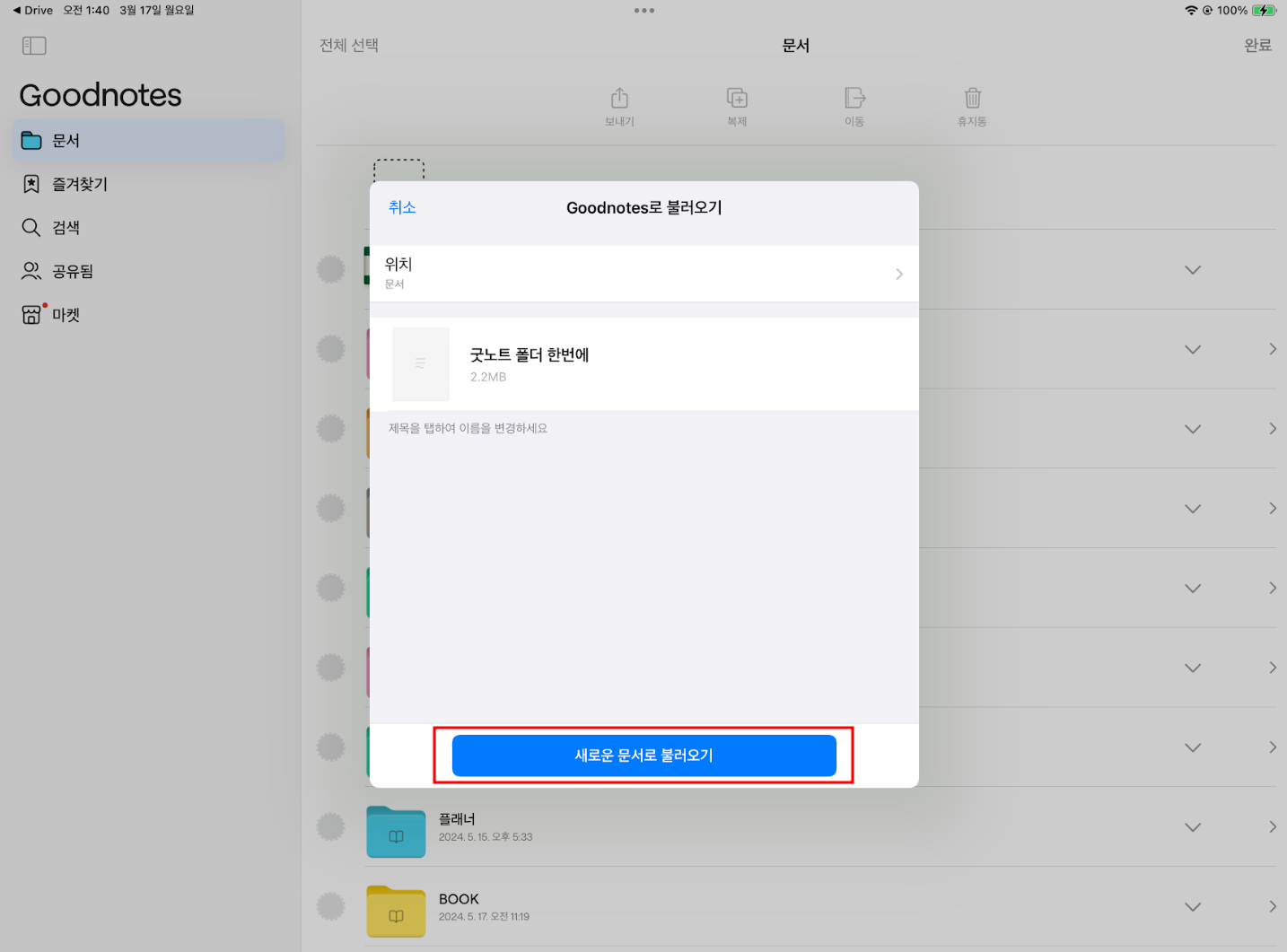5-1 굿노트에서 불러오기 창이 뜨는데 '새로운 문서로 불러오기'를 선택해줍니다.