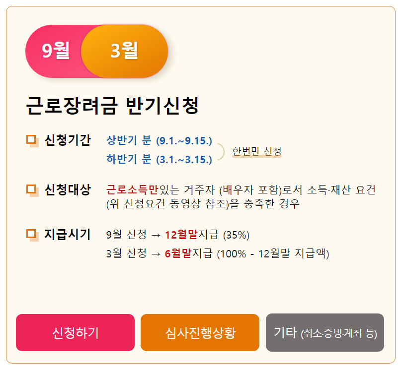 근로소득이 발생한 경우 반기신청이 가능하며 사업소득, 소득이 없는 자 등은 반기신청을 할 수 없습니다.