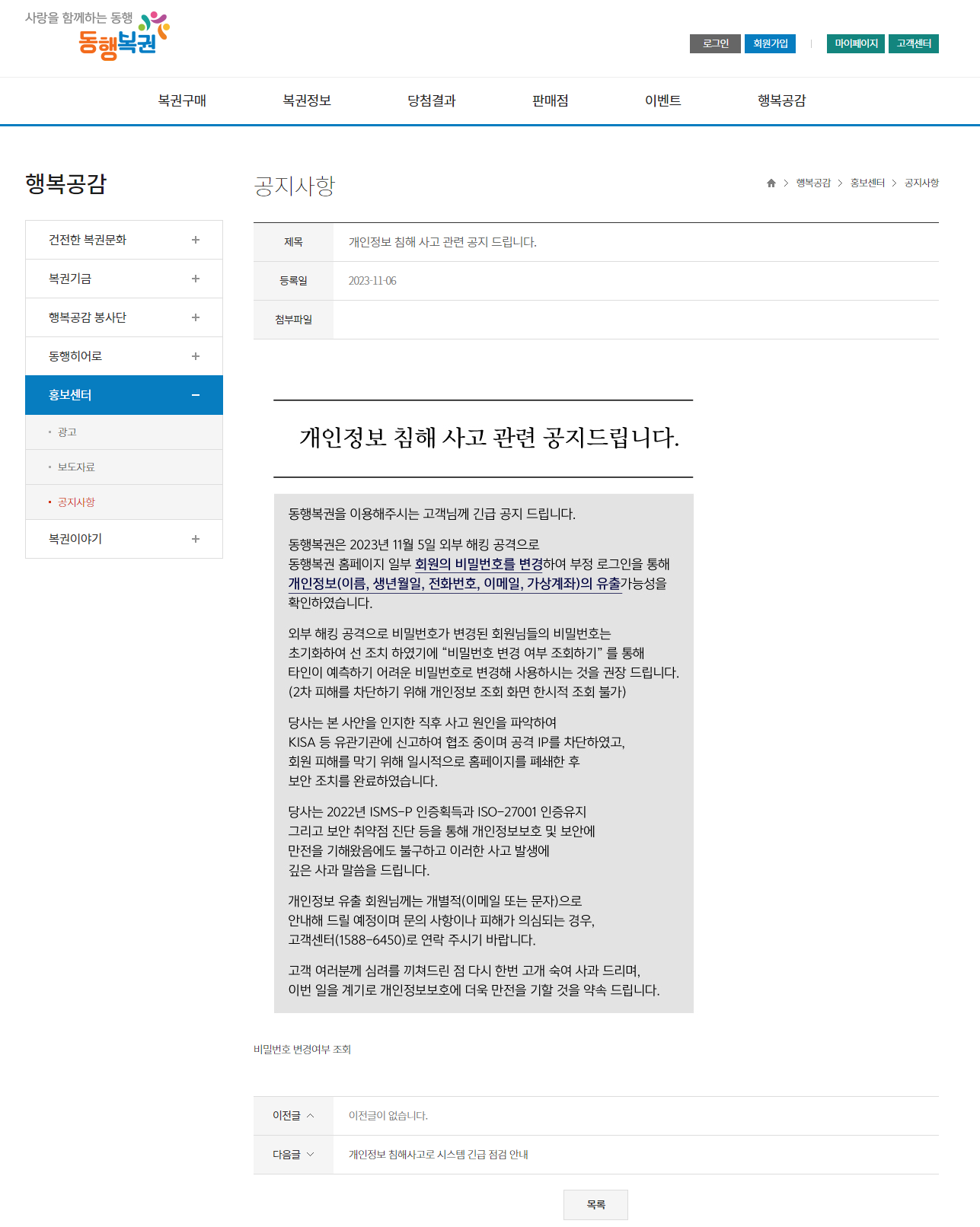 실제로 동행복권이 2023년 11월 5일 외부 해킹 공격을 받았다는 공지사항이 올라와 있었다.