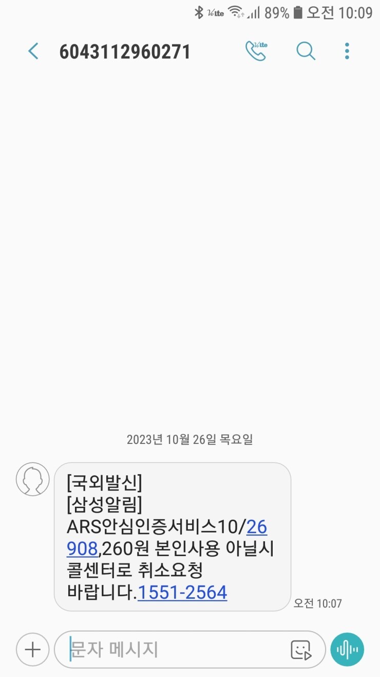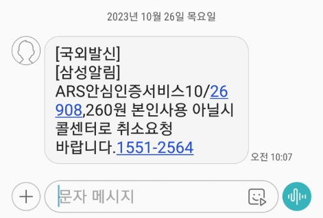 국외발신 [삼성알림] ARS안심인증서비스 10/26 908,260원 본인사용 아닐시 콜센터로 취소 요청바랍니다. 1551-2564 문자는 스팸문자 입니다.