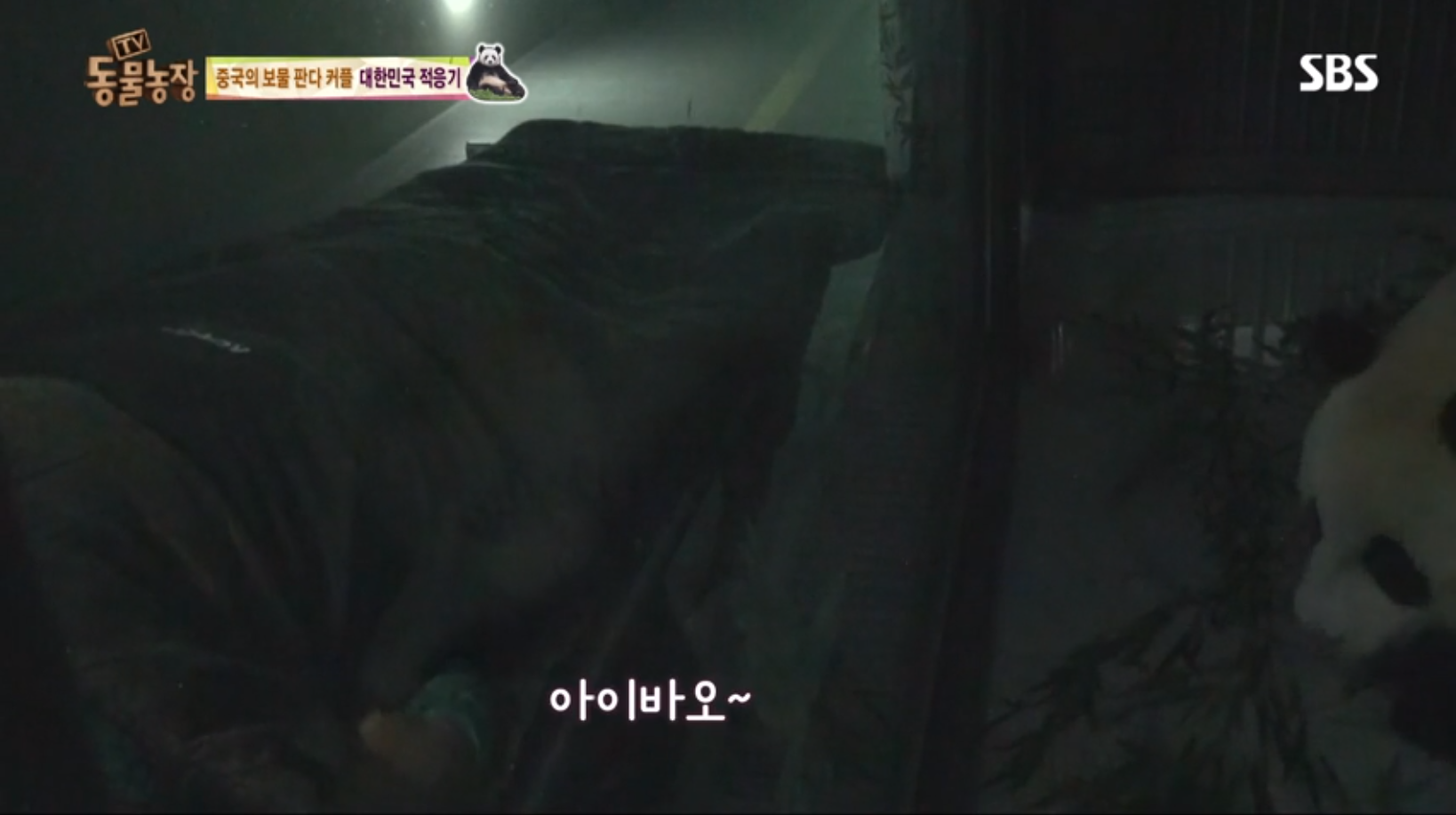 아이바오는 잠에 바로 들지 못하고, 강철원 사육사가 침낭을 갖고 오자 쳐다보고 있다.