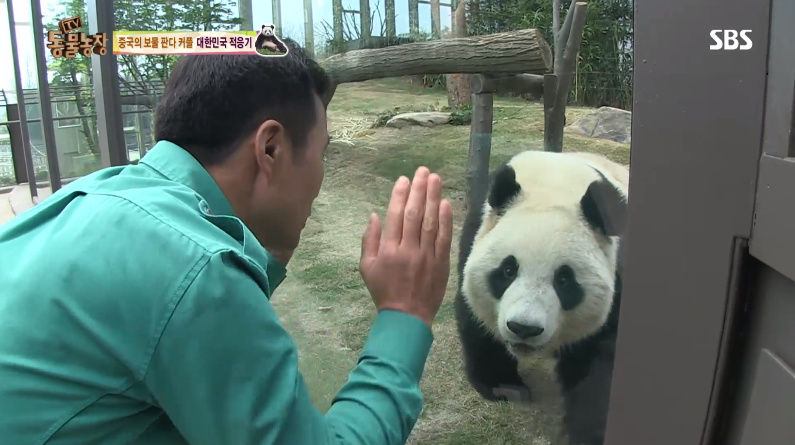 강철원 사육사가 옆에 있는 것을 확인한 아이바오(안심하라고 말해주는 사육사님이 유리에 손을 대자 아이바오도 자기 손을 마주 댄다.)