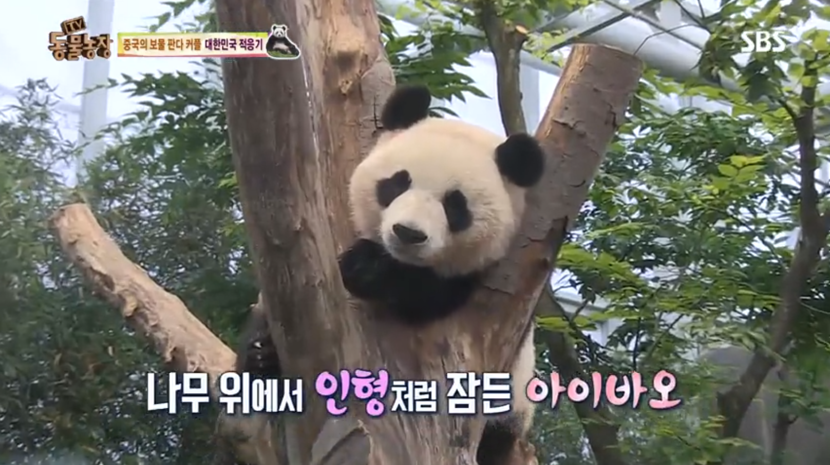 이제 적응을 잘했는지 나무 위에서 편하게 잠을 자는 아이바오(첫날 무성했던 나뭇잎들은 보이지 않는다)
