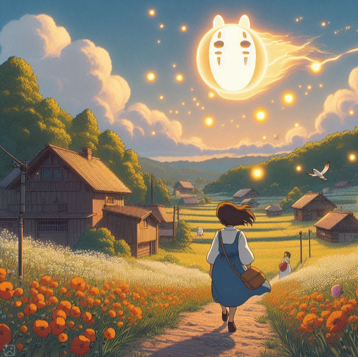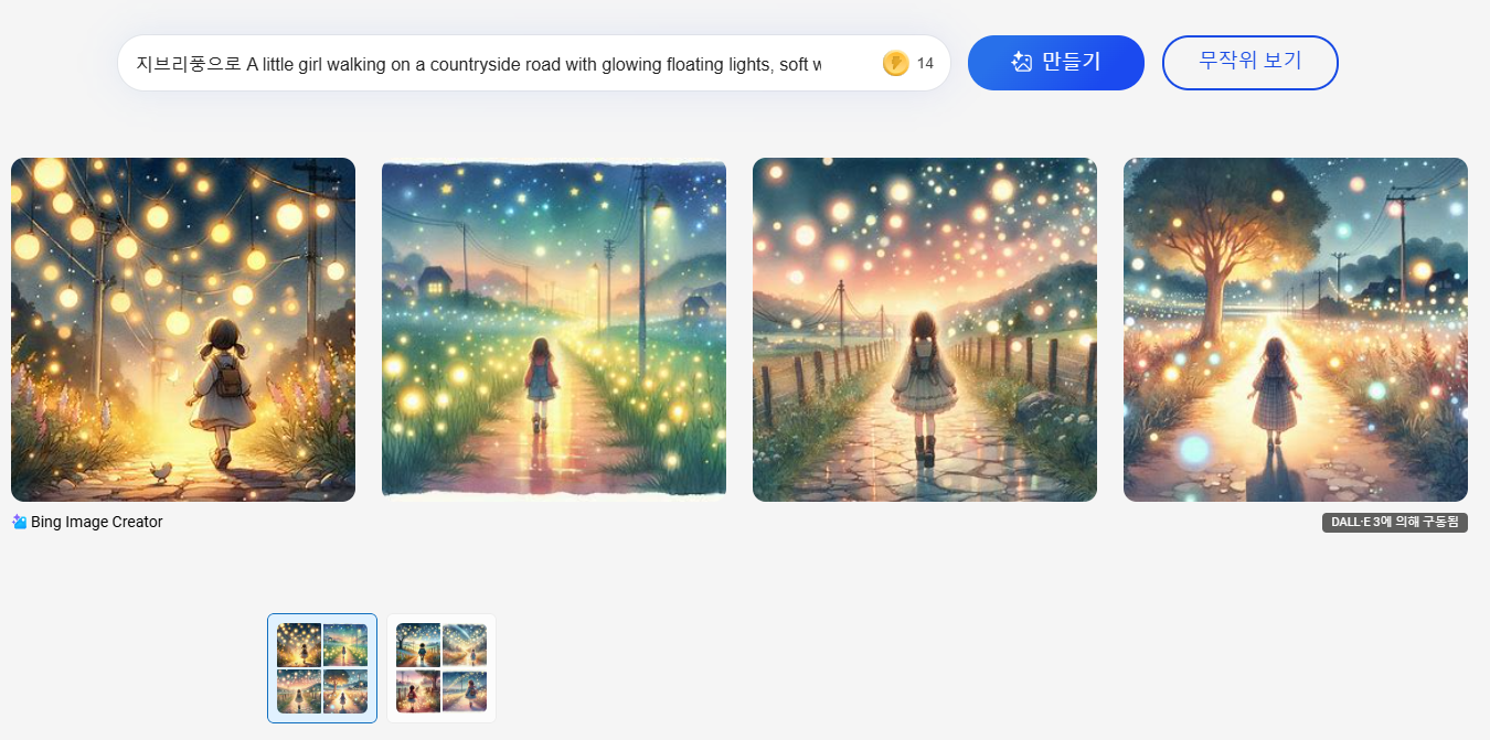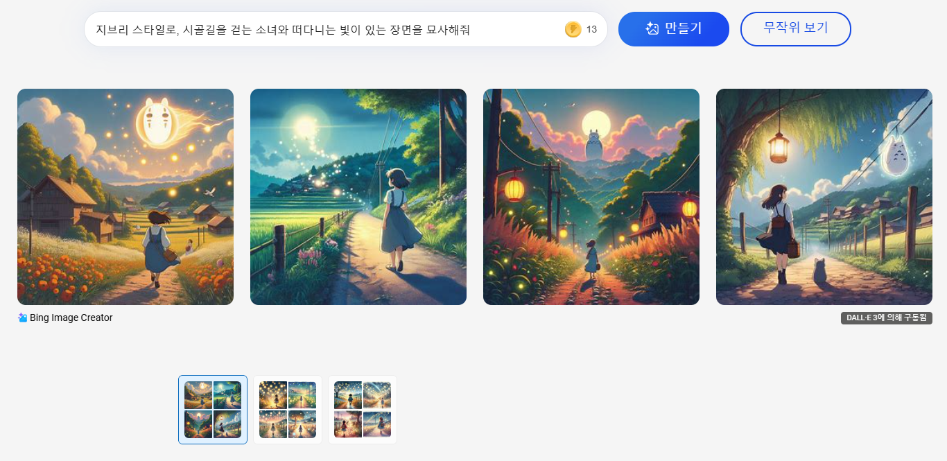 ChatGPT에게 먼저 “지브리 스타일 프롬프트 만들어줘”라고 요청한 후 그 문장을 복사해 Bing에 붙여넣으면 더욱 감성적인 결과가 나옵니다.