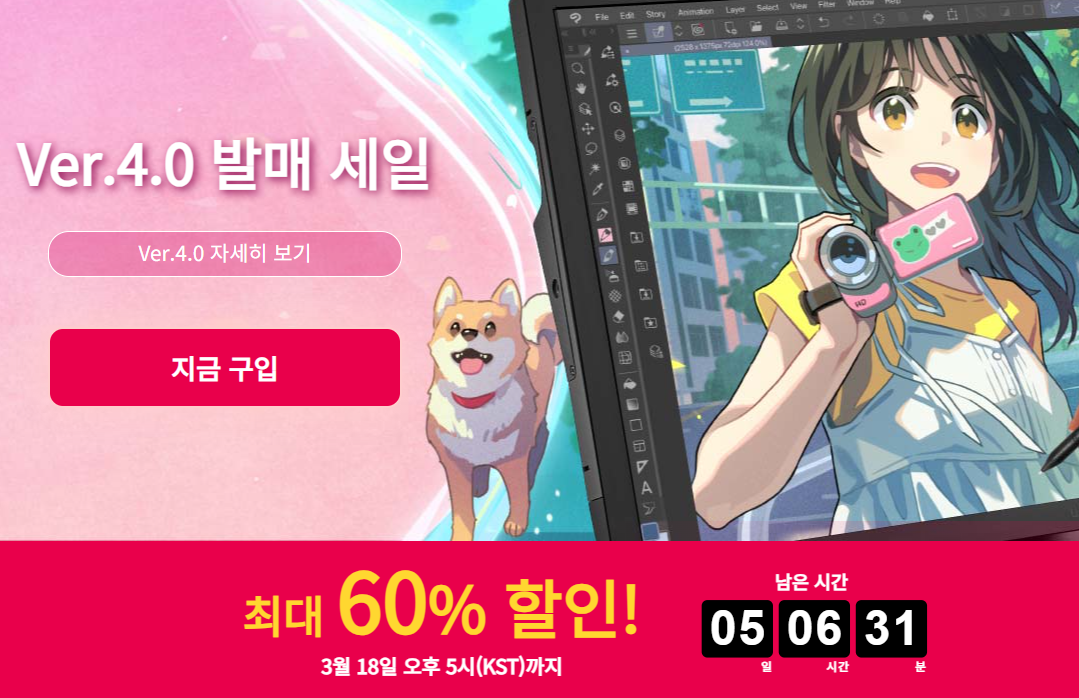 현재 클립스튜디오 공식 사이트에서는 최대 30% 할인된 가격으로 제품을 구매할 수 있는 프로모션을 진행 중입니다. 이 프로모션은 2025년 3월 18일 오후 5시(KST)까지 진행되며, 다양한 라이선스 옵션이 제공되고 있습니다