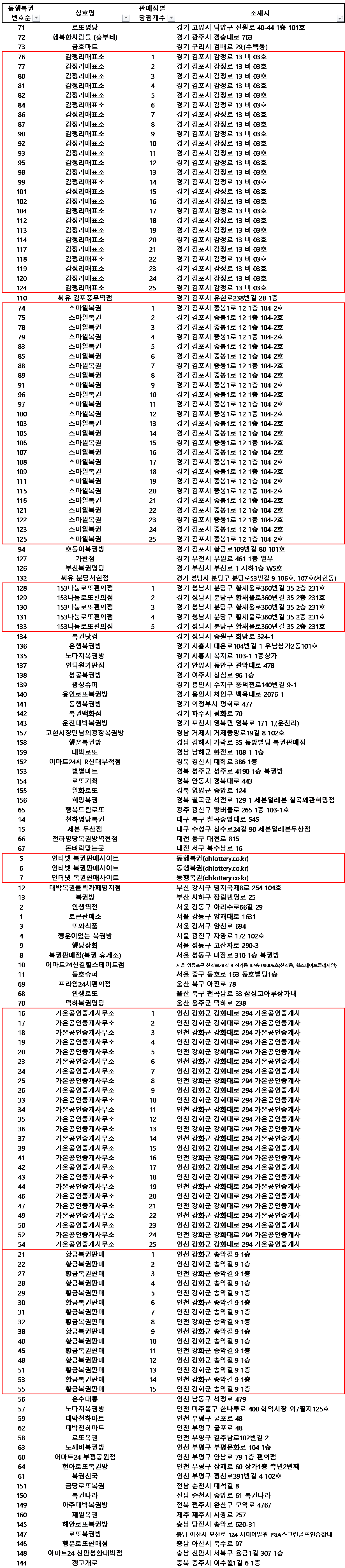 25개 당첨된 판매점이 3곳이며, 15개 당첨된 곳은 1곳입니다. 여기서 지역 소재도 중복되고 있습니다. 어찌된 일인지 궁금하네요. 당첨 번호를 알고 있어서 구매한거라 예측한다면 총 90개 당첨이며 9만원에 구입할 수 있는 가격입니다. 인천 강화군과 경기 김포시는 먼 거리도 아닌데요. 참으로 신기한 당첨 회차 입니다.