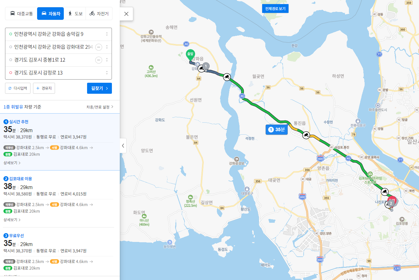 인천 강화군 -> 경기 김포시 자동차로 35분 거리