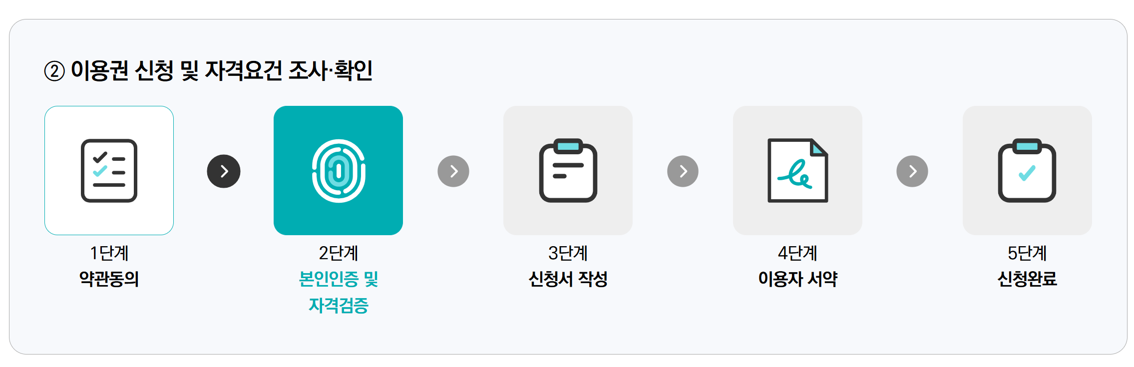 • 약관동의 → 본인인증 및 자격검증 → 신청서 작성 → 이용자 서약 → 신청완료