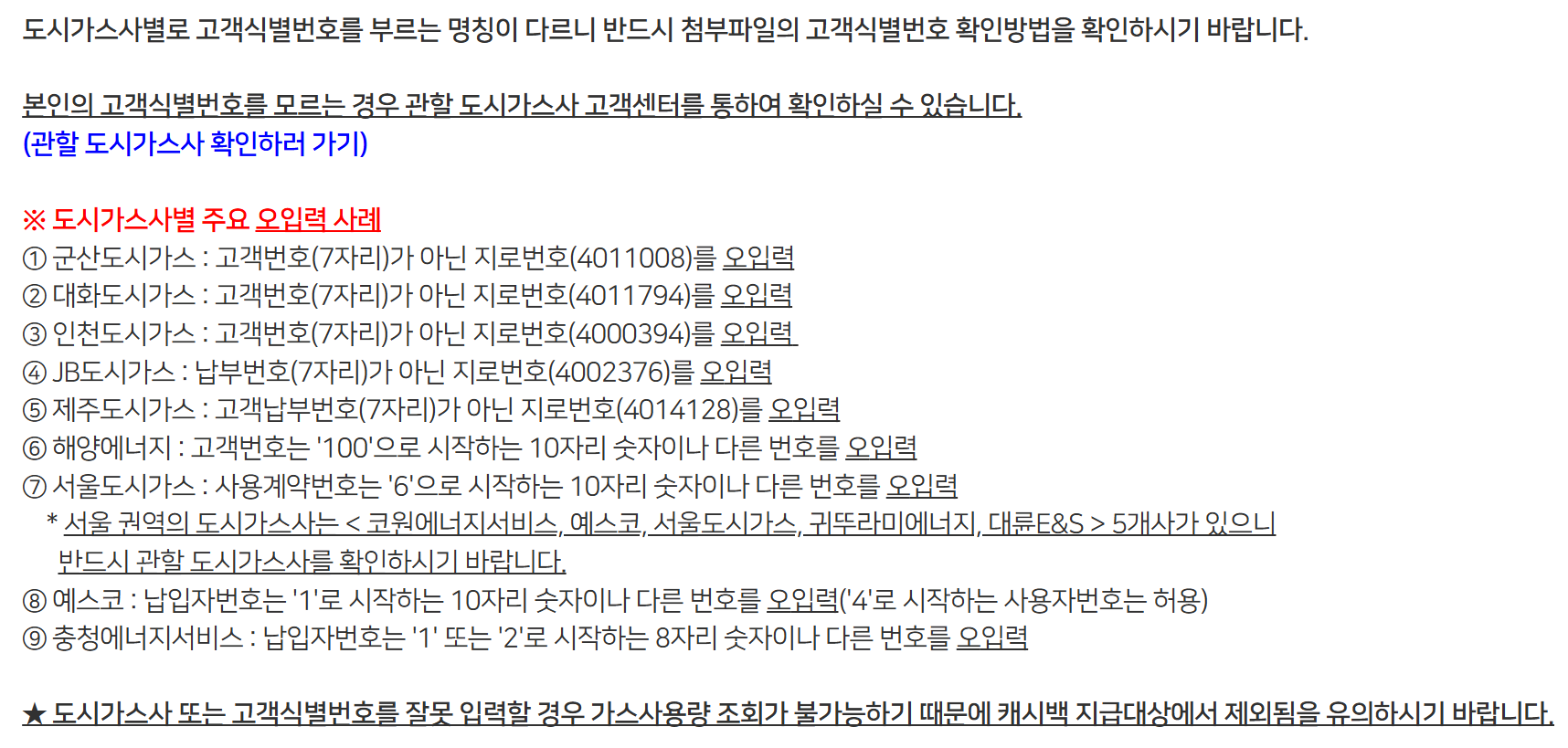 도시가스사별로 고객식별번호를 부르는 명칭이 다르니 반드시 고객식별번호 확인방법을 확인하시기 바랍니다.