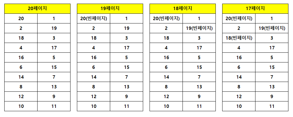 예를 들어 22페이지를 인쇄한다고 하면 이럴 경우 빈페이지를 넣어줘서 4 배수인 24페이지를 만들어줍니다.