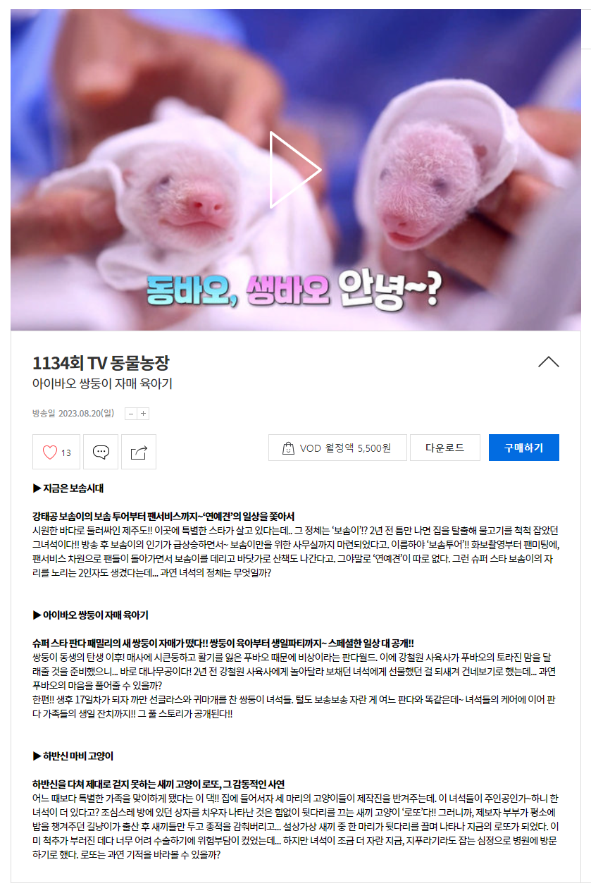 방송일 2023.08.13(일) 1133회 아이바오 쌍둥이 자매 출산