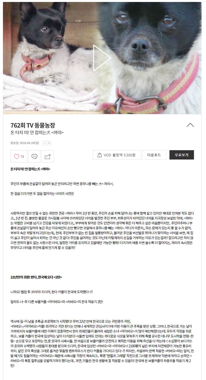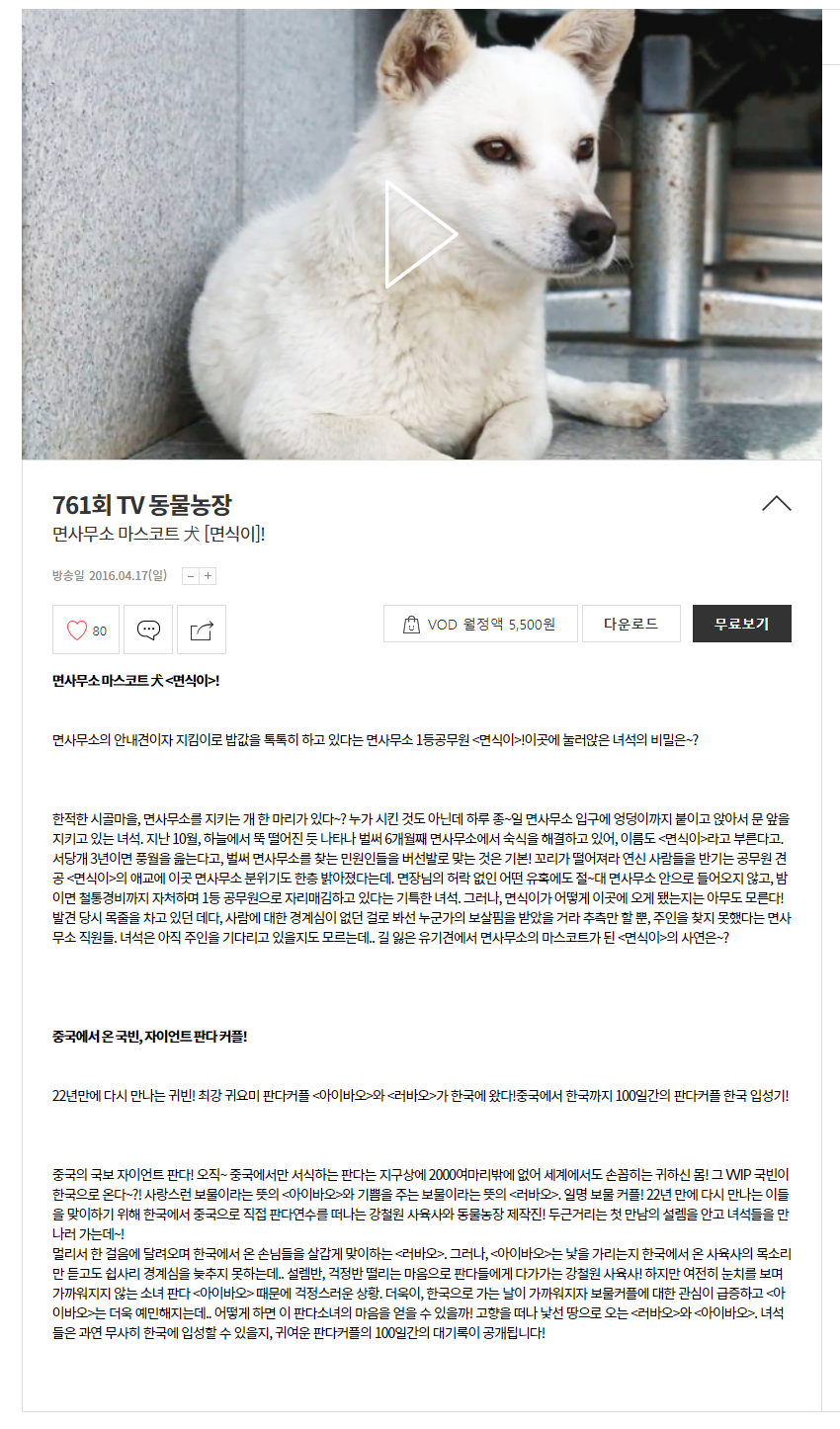 안녕하세요! 바오가족을 좋아해서 TV동물농장 방송을 찾아보다 출연 회차 정보가 없는 듯하여 판다 가족을 좋아하시는 분들도 쉽게 찾아보시라고 회차정보 공유합니다.