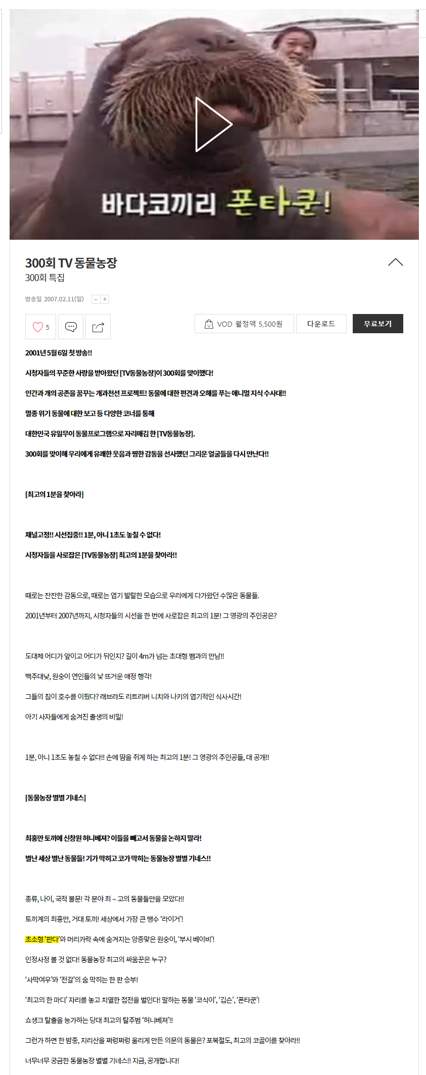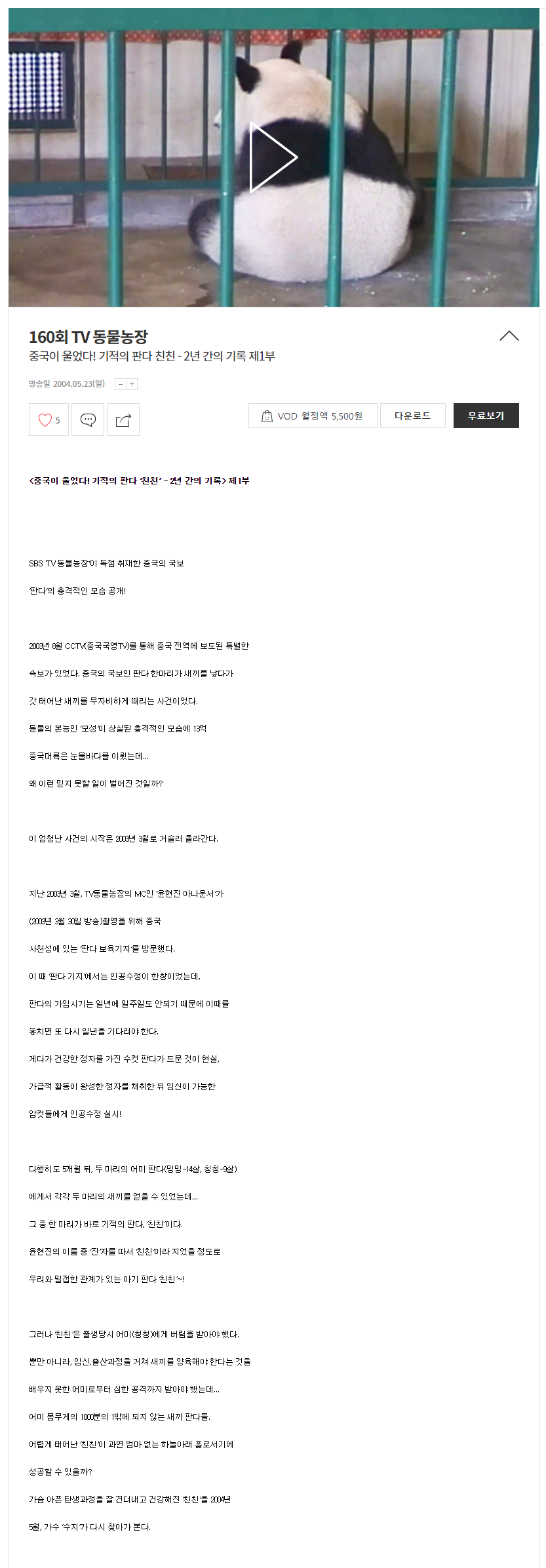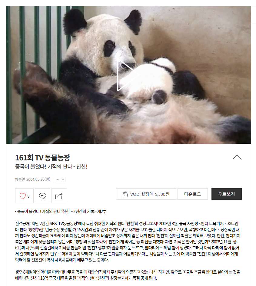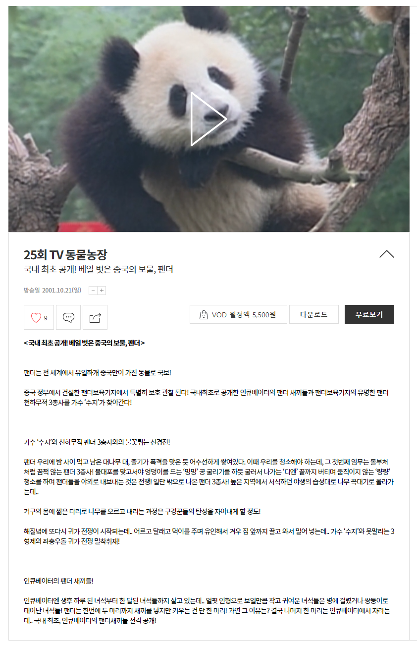- 판다를 국내에 처음 소개하는 만큼 판다의 기본 정보 및 특징을 알려주고 있어 판다에 대한 정보가 없는 분들은 판다를 이해 하는데 도움이 되는 방송입니다. (개인적인 생각)