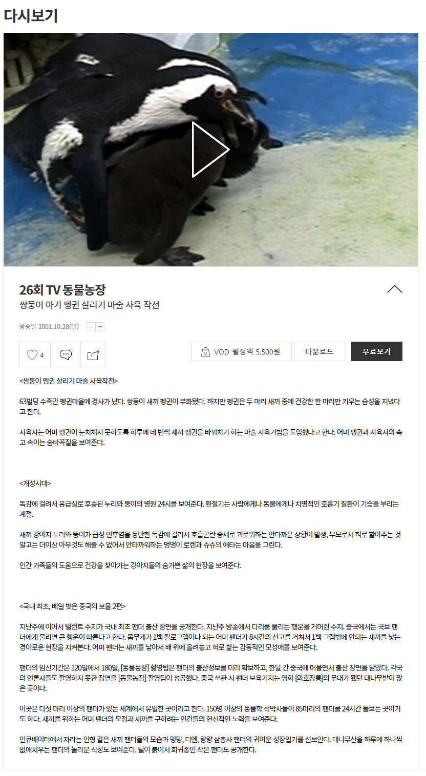 - sbs TV동물농장 다시보기 : 17:15 ~ 18:32 (웨이브 X)